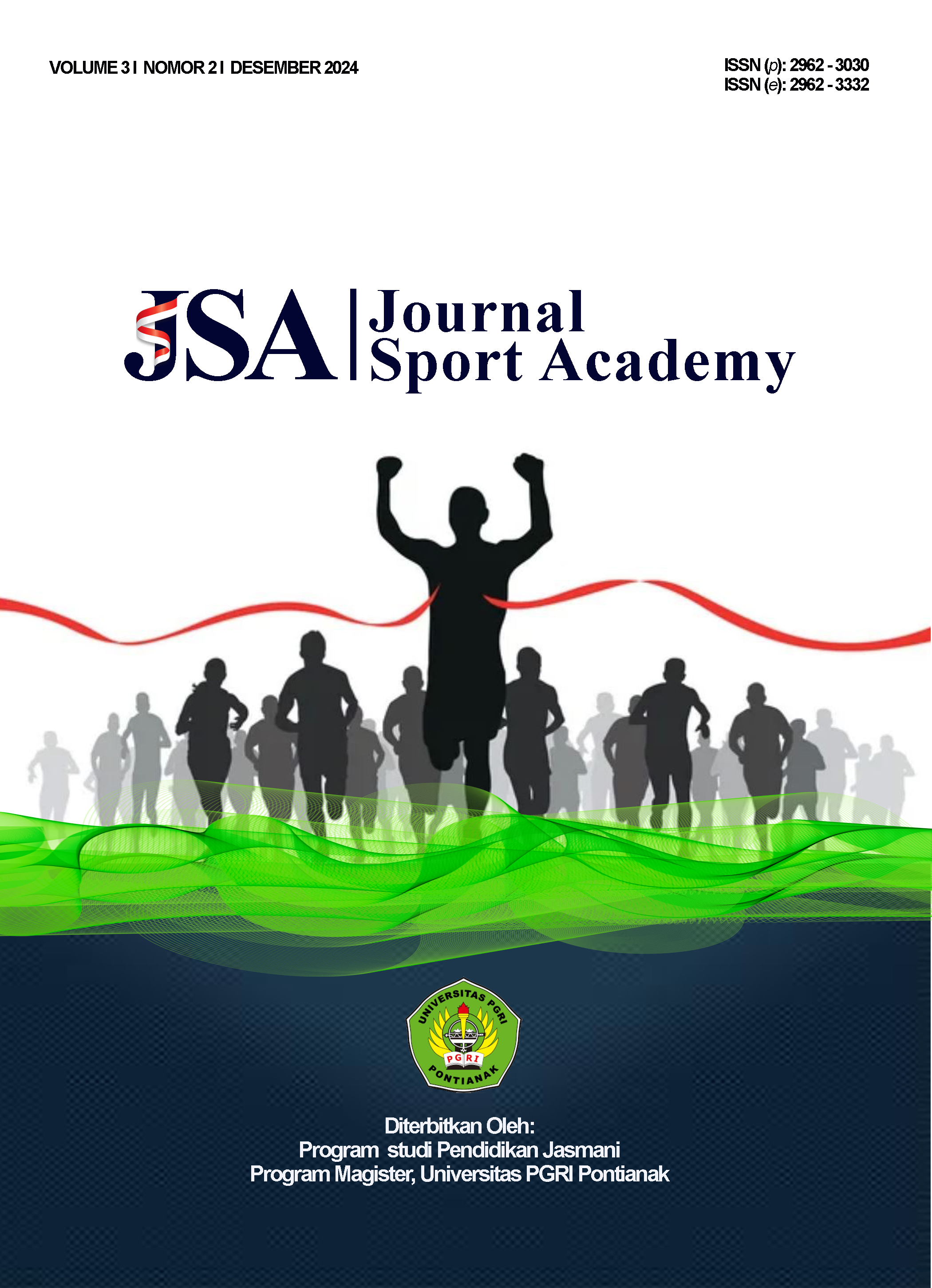 Vol. 3 No. 2 (2024)Journal Sport Academy (JSA) is a scientific journal published by the Master’s Program in Physical Education, Universitas PGRI Pontianak. This journal serves as a platform for the dissemination and communication of research findings to both academics and the general public in the field of sports and its applications. The scope of the journal includes Physical Education, Sports Coaching, Physical Activity, Traditional Sports, Health Sports, and Disability Sports.